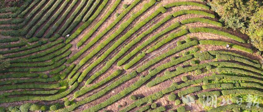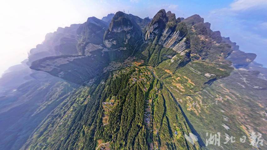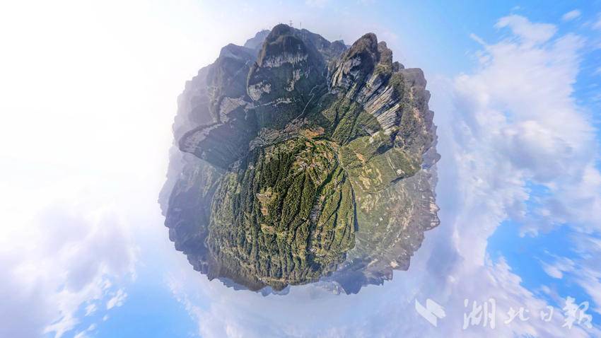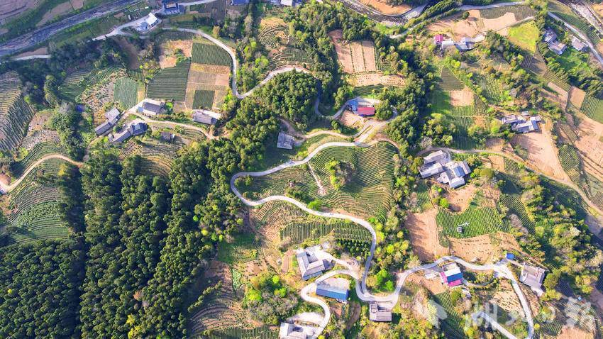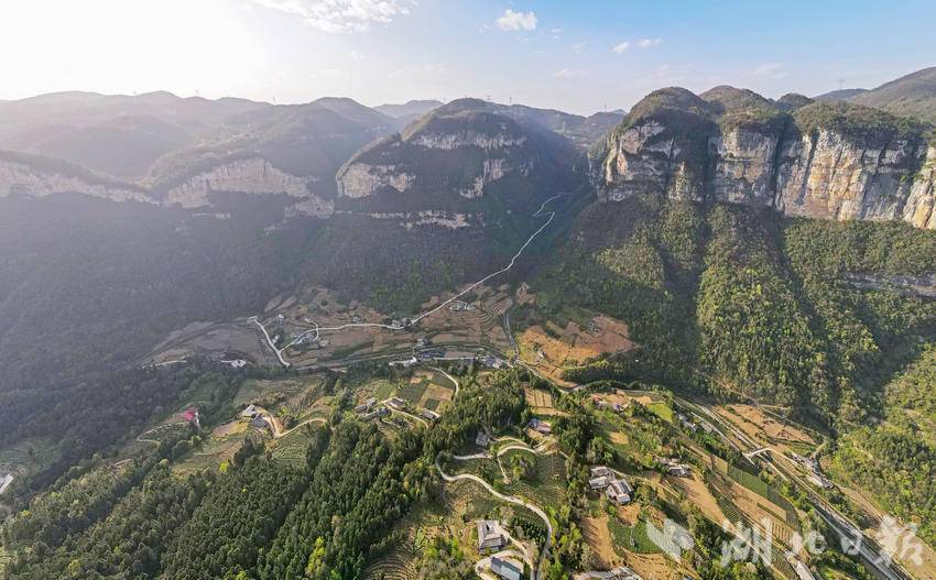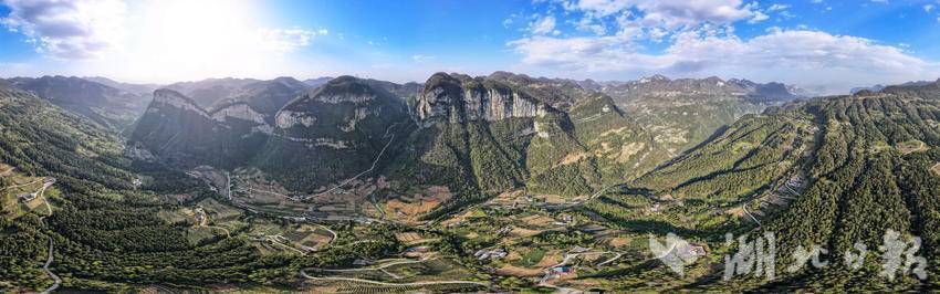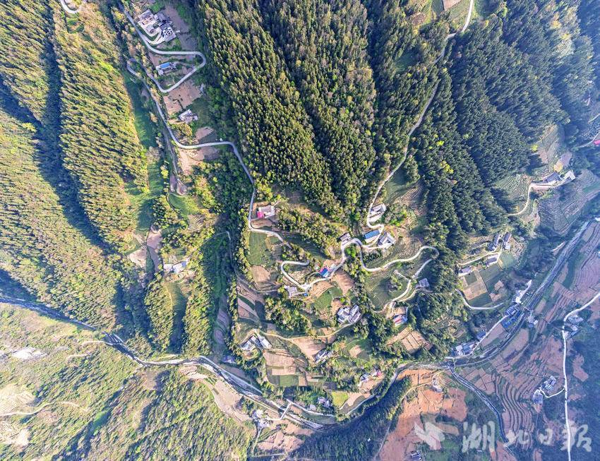 4月4日,蓝天白云之下,恩施市沙地乡鹤峰口村境内的村居、盘山公路、青山、茶园、绝壁、河流相互映衬,绘就一幅色彩斑斓的春日乡村生态图景。